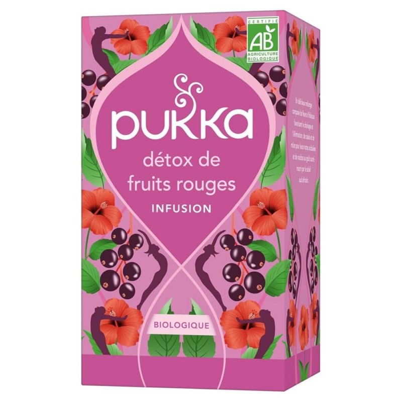 L'infusion certifiée bio Pukka est un délicieux mélange composé de fleurs d'hibiscus, favorisant le drainage et l'élimination, de cassis et de mûre pour leurs notes gourmandes et acidulées, et de rooibos au goût sucré nourri par le soleil sud africain.